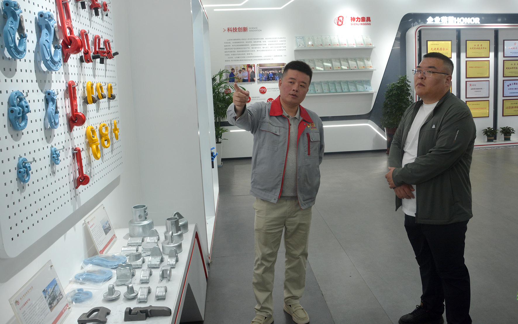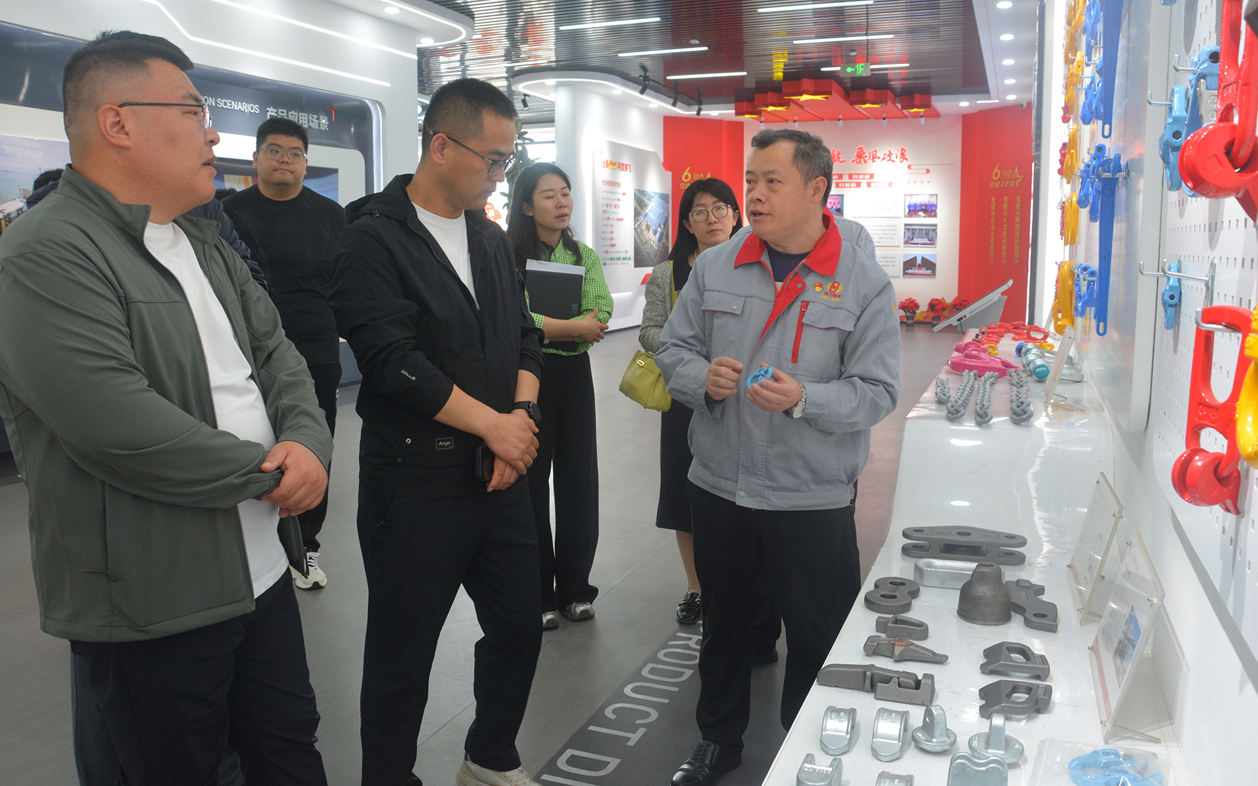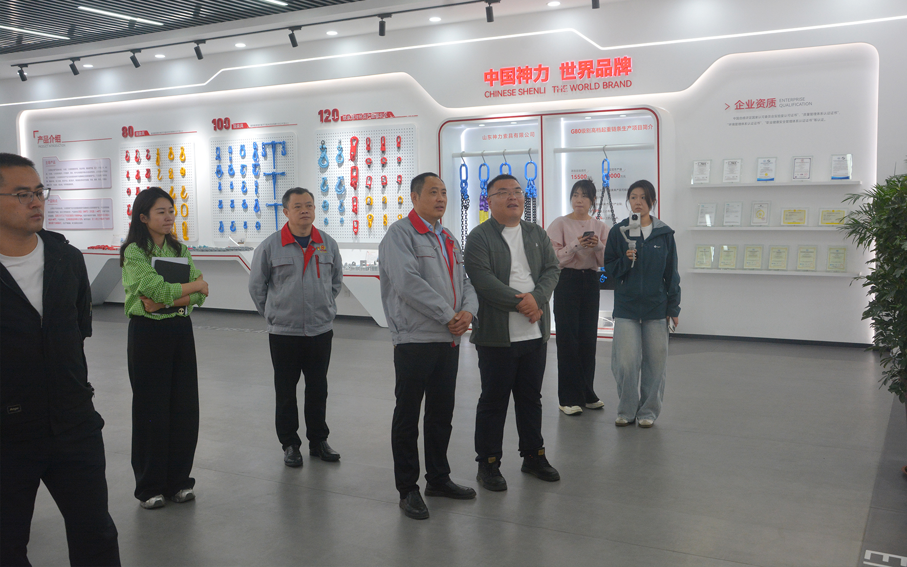 拳头产品展区集中展示G120级高端索具、高强度卸扣等核心产品,彰显行业领先的技术标准与品质实力;在科技创新阵地,走进研发中心与实验室,观摩专利墙、材料疲劳试验、拉力测试等硬核环节,感受技术攻关的不懈追求;走进智能车间,见证全自动化生产线、机器人精密加工的高效运转,体验“中国智造”的精准与高效;媒体一行了解绿色供应链管理、全流程减碳、循环回收等环保举措,展现企业可持续发展的责任担当。