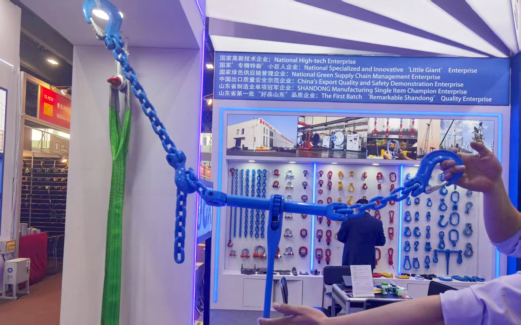 同时,神力索具持续拓展产品矩阵,致力于提供更轻便、更省心的组合索具方案。新推出的电泳蓝配色100级链条,以醒目外观满足客户的个性化定制需求;DNV卸扣专为严苛环境打造,通过权威认证,实现极致性能与可靠性。从灵活轻便的组合索具到定制化链条,再到高强度卸扣,神力索具以丰富多元的产品体系,全面覆盖各类起重吊装场景。