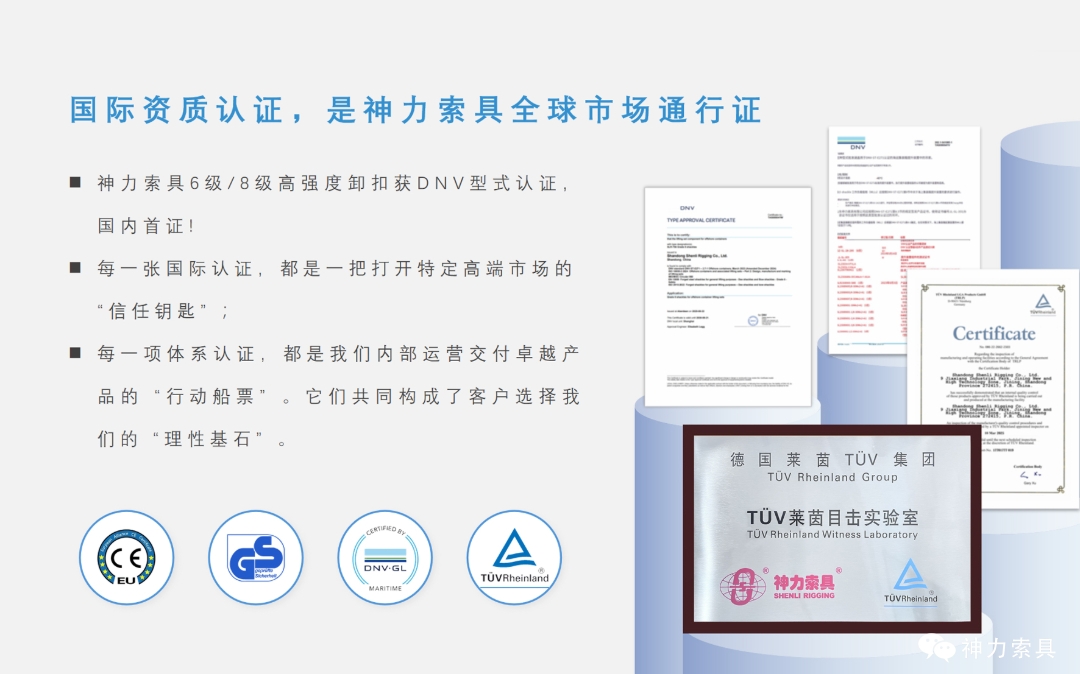 千钧品质,护航极限吊装安全。索具虽小,却系千钧之重。神力索具始终将质量视为企业的生命线,对卓越品质的追求刻在骨子里。我们采用欧盟EN1677等国外先进技术标准,通过了ISO9001质量体系认证、ISO14001环境体系认证及ISO45001职业健康安全认证。众多核心产品更获得了全球公认最严苛的欧盟CE认证、德国GS认证、挪威船级社(DNV)认证以及IATF16949认证等。每一件产品的出厂,都承载着神力对“零故障”的极致承诺。